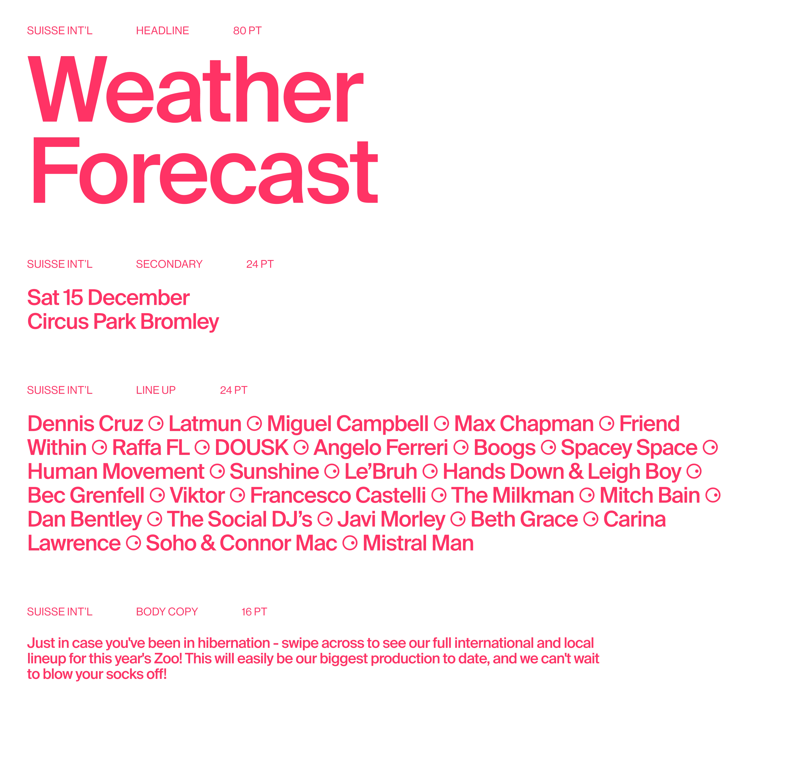 Custom typography was created for artist announcements.